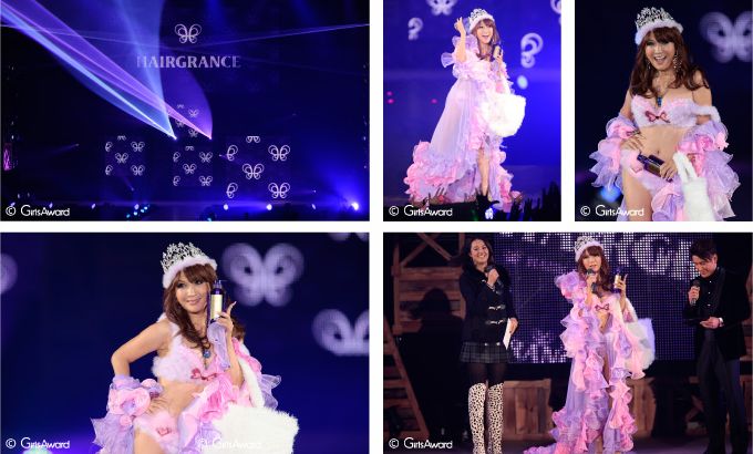 トップヘアメイクアップアーティスト8人がプロデュースしたノンシリコンの高品質ヘアケアシリーズHAIRGRANCEをイメージキャラクターのはるな愛さんがステージ上で紹介! はるな愛さんの超セクシーな衣装に会場もMCの魔裟斗さんもびっくり。魔裟斗さんは、はるな愛さんの髪の香りの良さに「女の匂いがする…」と驚いていました!